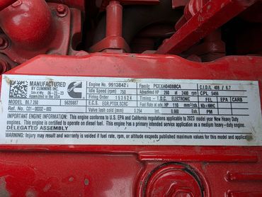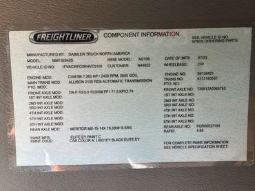 VIN-1FVACWFC0RHVC5106, Mileage-37,802 mi, Hours-2,097, Horsepower-260 HP, Engine-CUMMINS ISB6.7, Engine Serial Number-99138421, Exhaust Brake, Transmission-Allison 2100 RDS, Number of Speeds-5 Spd, Ratio-4.88, Suspension-AirLiner, Gross Vehicle Weight Rating-Class 6: 19,501 - 26,000 pounds, Gross Vehicle Weight-26,000 lb, Front Axle Weight-10,000 lb, Rear Axle Weight-18,000 lb, Tires-255/70R22.5, Wheelbase-234 in.